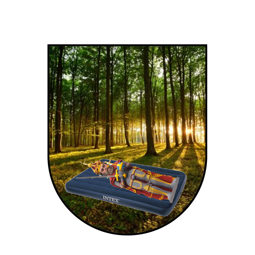 Das Wappen zeigt einen Roland auf einer Luftmatratze im Wald Ficklands.